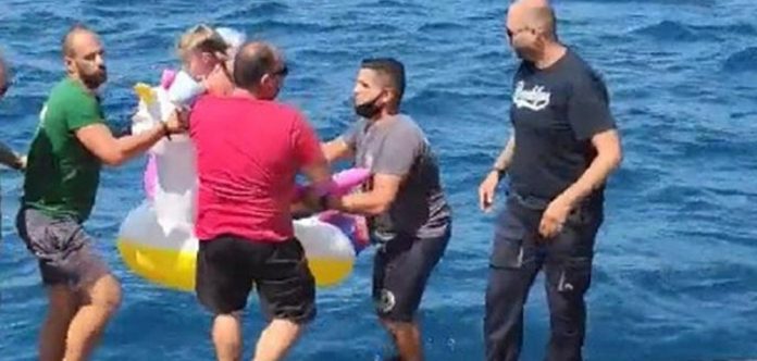 Όλοι όσοι έκαναν μπάνιο μπήκαν στην θάλασσα και έτρεξαν να βοηθήσουν αλλά κανένας δεν μπορούσε να το φτάσει. Το φουσκωτό έτρεχε γρήγορα προς την αντίθετη κατεύθυνση από την παραλία. Ακόμα και με ένα βαρκάκι προσπάθησαν να το πιάσουν αλλά μάταια.