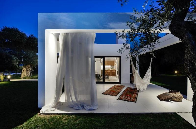 Το λευκό χρώμα, το ξύλο, τα μεγάλα ανοίγματα και το στοιχείο νερού χρησιμοποιούνται για να ενισχύσουν την αρχιτεκτονική ιδέα, δημιουργώντας καθαρές επιφάνειες και ένα περιβάλλον που ενσωματώνει αρμονικά μια μποέμ πολυτέλεια.