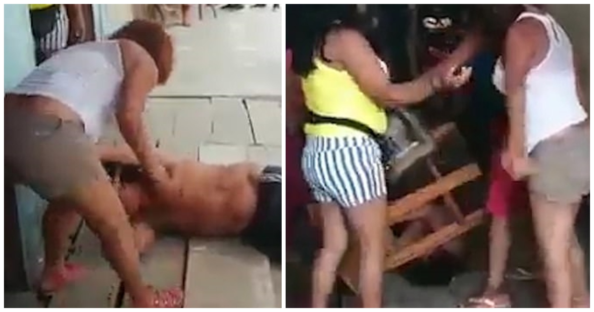 Το παρακάτω βίντεο δείχνει μία γυναίκα να επιτίθεται στο σύζυγό τη με ένα σκαμπό τη στιγμή που τον βλέπει να μιλάει με μία παρέα γυναικών.