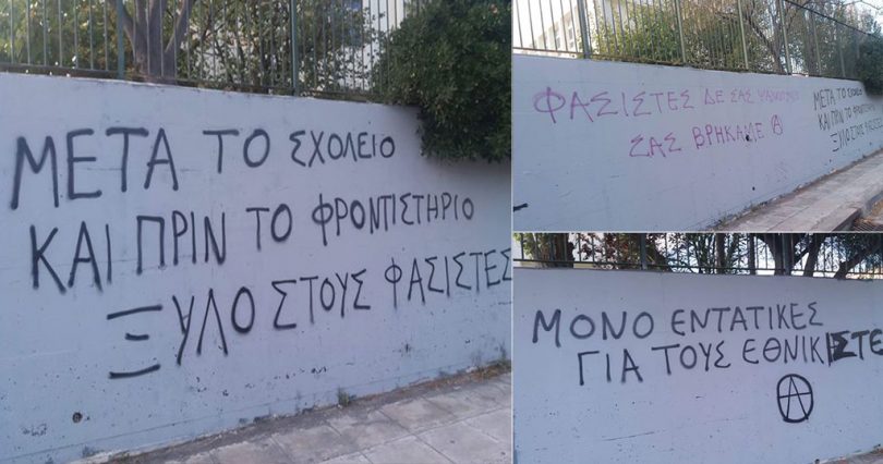 Τα συνθήματα που αναγράφηκαν ήταν «ΦΑΣΙΣΤΕΣ ΔΕΝ ΣΑΣ ΨΑΧΝΟΥΜΕ ΣΑΣ ΒΡΗΚΑΜΕ», «ΜΕΤΑ ΤΟ ΣΧΟΛΕΙΟ ΚΑΙ ΠΡΙΝ ΤΟ ΦΡΟΝΤΙΣΤΗΡΙΟ ΞΥΛΟ ΣΤΟΥΣ ΦΑΣΙΣΤΕΣ», «ΜΟΝΟ ΕΝΤΑΤΙΚΕΣ ΓΙΑ ΤΟΥΣ ΕΘΝΙΚΙΣΤΕΣ», «ΟΙ ΚΑΤΑΛΗΨΕΙΣ ΕΙΝΑΙ ΕΣΤΙΕΣ ΕΛΕΥΘΕΡΙΑΣ ΟΧΙ ΦΡΟΝΤΗΣΤΗΡΙΑ ΕΘΝΟΙΔΕΟΛΟΓΙΑ» και «ΠΑΝΤΑ ANTIFA».