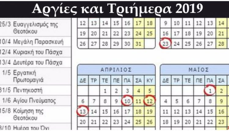 ΔευτέραΕργατική Πρωτομαγιά 1 Μαΐου 2019 ΤετάρτηΠεντηκοστή 16 Ιουνίου 2019 ΚυριακήΑγίου Πνεύματος 17 Ιουνίου 2019