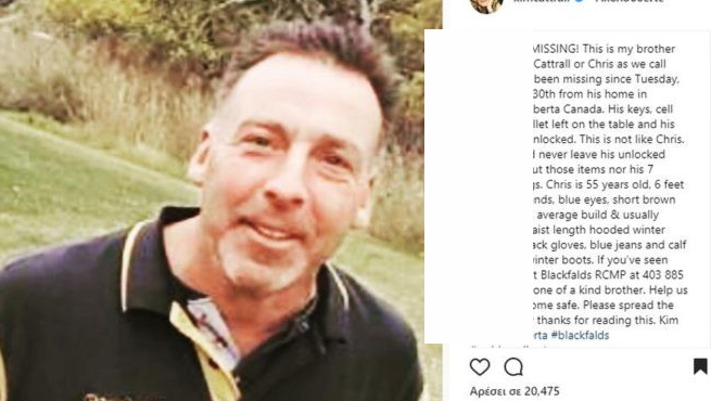 Αν τον έχετε δει επικοινωνήστε με το Blackfalds RCMP στο 403 885 3300. Είναι ένας πολύ καλός αδελφός. Αν τον δείτε βοηθήστε να τον φέρουμε σπίτι ασφαλή. Παρακαλώ διαδώστε το. Σας ευχαριστώ πολύ. Kim»