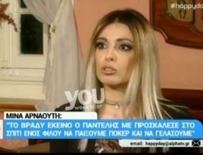 Στην εκπομπή του Αντώνη Σρόιτερ, Αυτοψία, βρέθηκε καλεσμένη η Μίνα Αρναούτη.Η συνέντευξη της θα προβληθεί το βράδυ της Τετάρτης και η 31χρονη καλλονή θα μιλήσει για πρώτη φορά τηλεοπτικά, μετά το δυστύχημα που στοίχισε τη ζωή στον Παντελή Παντελίδη. Διαβάστε παρακάτω…Σε σχετικό απόσπασμα που προβλήθηκε στο Happy Day ακούμε την Μίνα Αρναούτη να λέει, μεταξύ άλλων: «Εμένα ο Παντελής όταν μου είπε “αν θέλεις να έρθεις εκεί”, μου είπε ότι θα πάμε σε ένα σπίτι που είναι ο φίλος μου ο τάδε, να παίξουμε λίγο πόκερ,