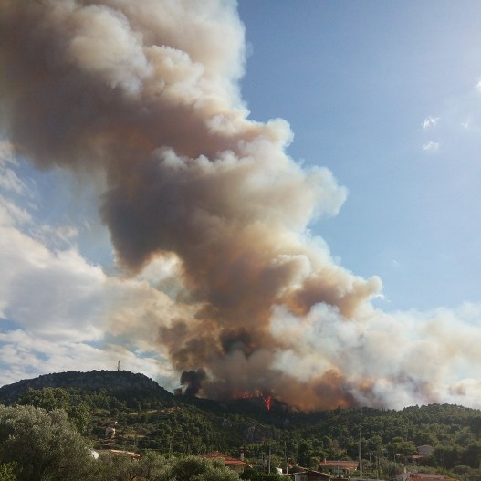 Το μέτωπο της φωτιάς λόγω των ισχυρών ανέμων αυξάνεται ταχύτατα και πλέον το χωριό του Καλάμου έχει περικυκλωθεί από τη φωτιά.