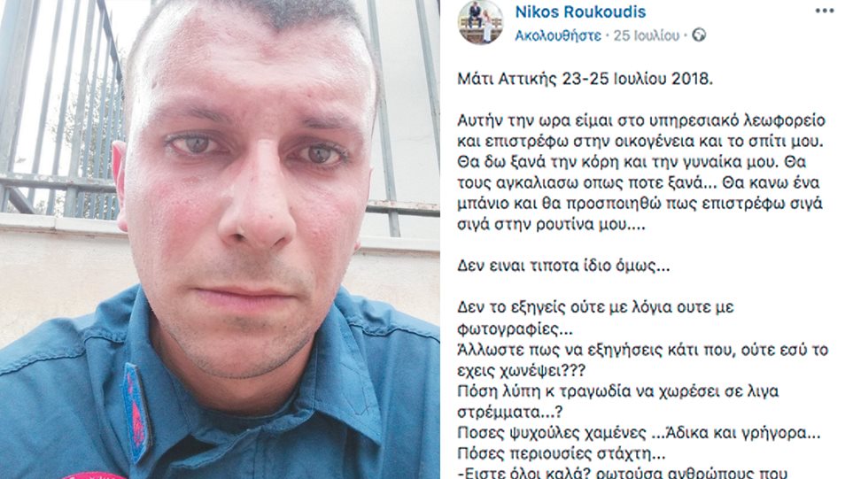 Μέσα σε λίγες γραμμές ο Νίκος Ρουκούδης κατάφερε να πει όλα όσα βίωσαν οι εκατοντάδες πυροσβέστες που έπεσαν στη μάχη της φωτιάς, αλλά και οι πολίτες που έβλεπαν σε ζωντανή μετάδοση την ανείπωτη εθνική τραγωδία. Η ανάρτηση στο Facebook και η εικόνα του ίδιου με τη μαυρισμένη στολή και τα δακρυσμένα μάτια συγκίνησαν το Πανελλήνιο. Και η υπηρεσία του όχι μόνο δεν του συμπαραστάθηκε, όχι μόνο δεν τον βοήθησε να σταθεί στα πόδια του, αλλά τον τιμώρησε αρπάζοντας το 1/10 του μισθού του γιατί τόλμησε να εκφραστεί και να συγκινηθεί.