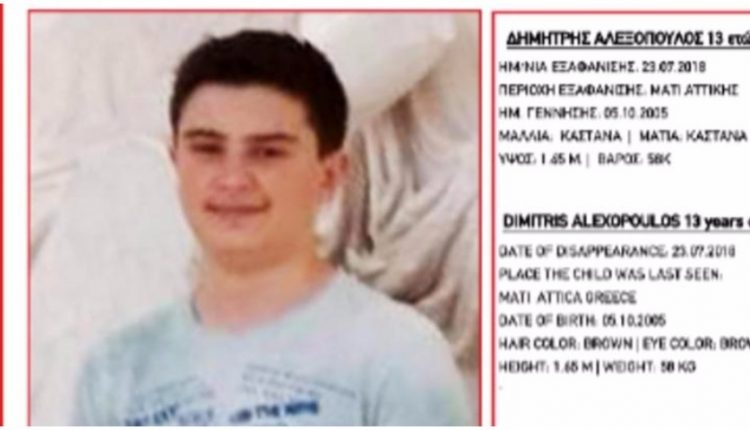 «Από τις 23/07/2018, στις 18:00, ο ανήλικος Δημήτρης Αλεξόπουλος, 13 ετών,αγνοείται από το Μάτι Αττικής.