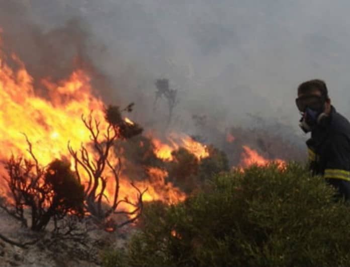 Σύμφωνα με την Πυροσβεστική η φωτιά καίει αγροτοδασική έκταση.