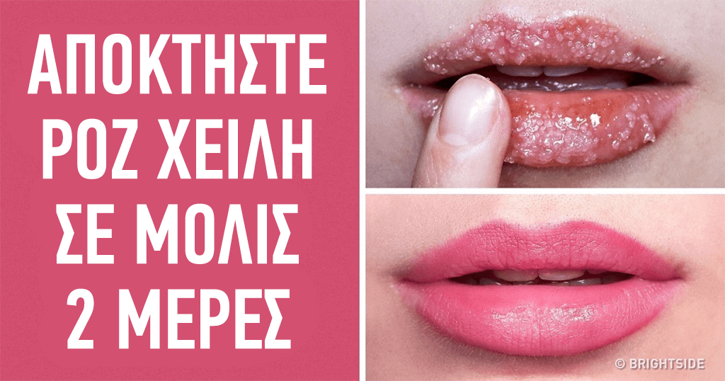 Αναμίξτε μια κουταλιά της σούπας μέλι, μια κουταλιά της σούπας ζάχαρης και μια κουταλιά της σούπας λάδι καρύδας. Κάντε απολέπιση για 5 λεπτά και μετά ξεπλύνετε. Κάντε αυτή την μάσκα καθημερινά, για να αποκτήσετε ροζ χείλη.