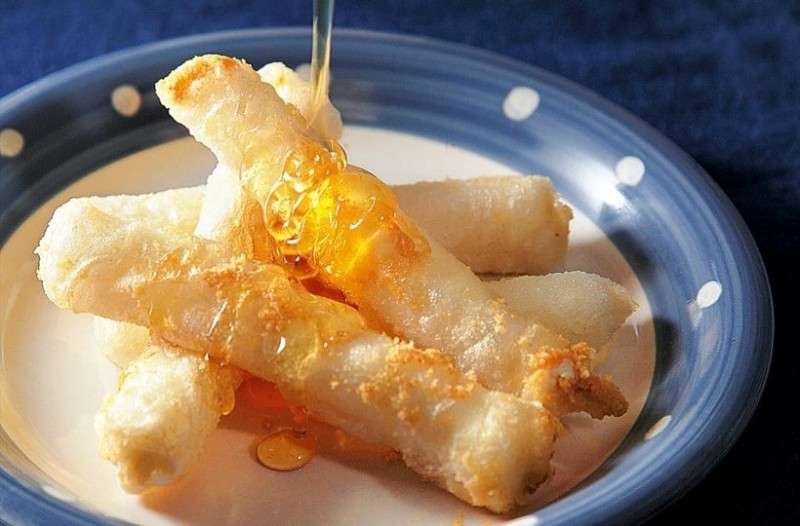 Τα στραγγίζουμε σε απορροφητικό χαρτί κουζίνας. Η φέτα στο εσωτερικό κάθε ρολού θα έχει μισολιώσει, έχοντας πάρει μορφή πυκνής κρέμας. Οσο είναι ακόμα ζεστά, τα μοιράζουμε σε πιάτα ή μπολάκια και τα περιχύνουμε με μέλι.