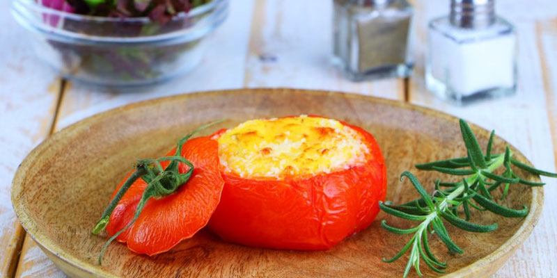 - Ρίξτε το μίγμα μέσα στην τομάτα και ψήστε για 30 λεπτά στους 200 βαθμούς Κελσίου.