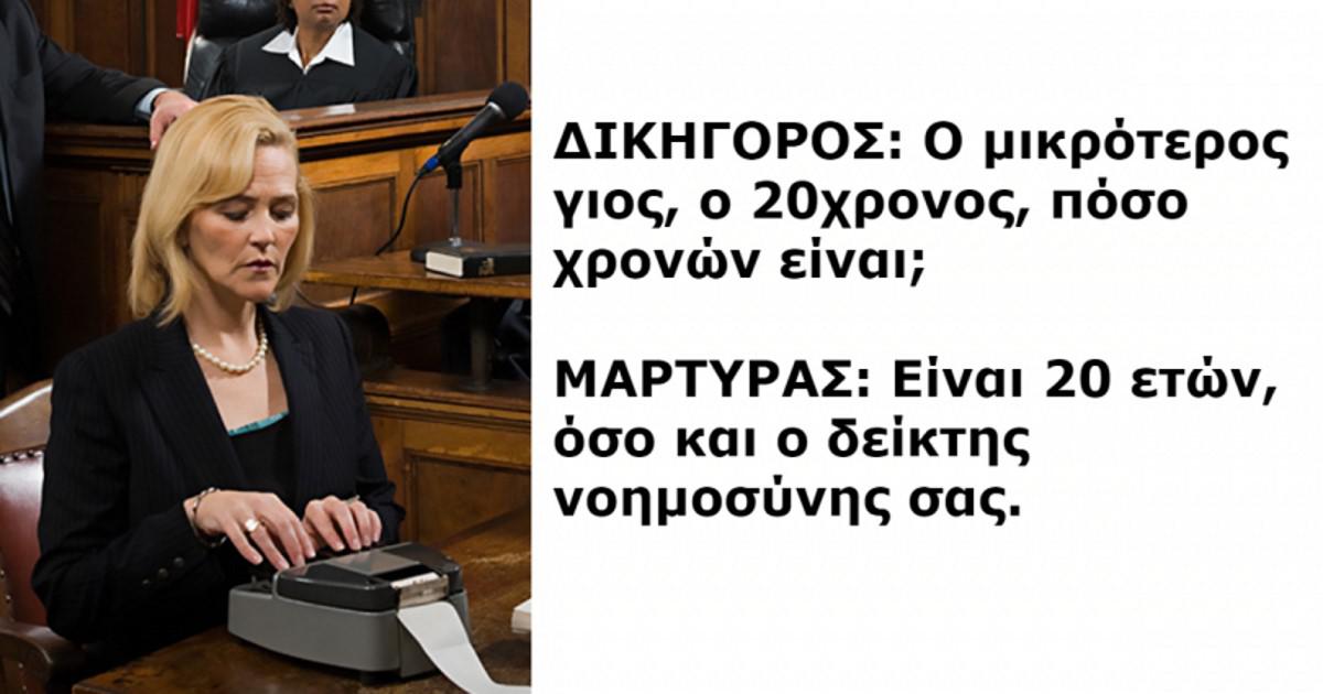 • ΔΙΚΗΓΟΡΟΣ: Πως έληξε ο πρώτος σας γάμος; ΜΑΡΤΥΡΑΣ: Με θάνατο.. ΔΙΚΗΓΟΡΟΣ: Και από ποια μεριά έληξε με θάνατο; ΜΑΡΤΥΡΑΣ: Μαντέψτε.