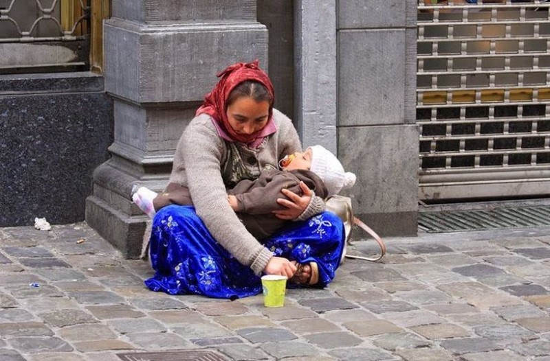 Η γυναίκα ζητιάνα κατάχαμα στο βρώμικο πάτωμα και δίπλα της το ποτηράκι, όπου οι περαστικοί προσφέρουν τον οβολόν τους. Στα χέρια της γυναίκας, κοιμάται ένα δίχρονο παιδάκι. Του φοράει ένα βρώμικο καπέλο και εξίσου βρώμικα ρούχα.