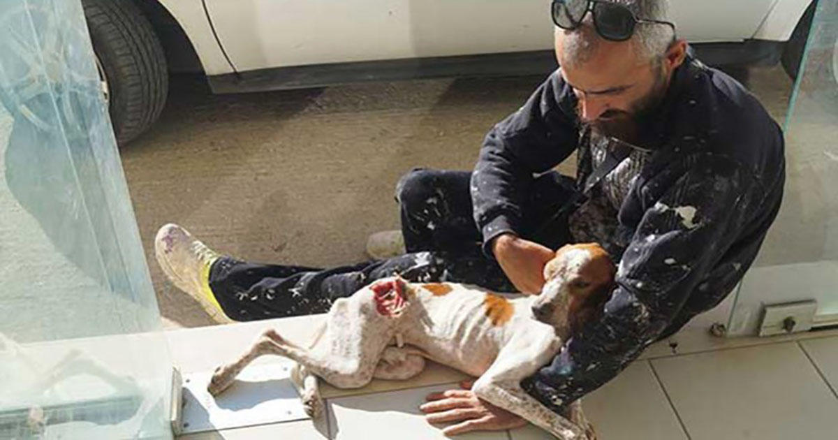 Το σκυλί ήταν τρομοκρατημένο και βαριά χτυπημένο με καραμπίνα κάποιου απάνθρωπου, παρόλα αυτά (δείτε καλά τα τραύματα στη φωτογραφία) αυτό κατάφερε να τρυπώσει στην αυλή του σωτήρα του όπου εκεί το βρήκε λουφασμένο , αδυνατισμένο με πολλά σκάγια στο πρόσωπο, χωρίς το ένα μάτι και γενικά σε πολύ κακή κατάσταση.