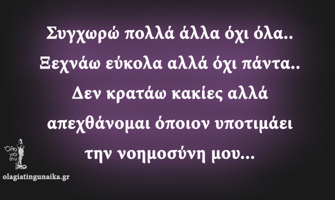 Συγχωρώ πολλά άλλα όχι όλα.. Ξεχνάω εύκολα αλλά όχι πάντα.. Δεν κρατάω κακίες αλλά απεχθάνομαι όποιον υποτιμάει την νοημοσύνη μου…