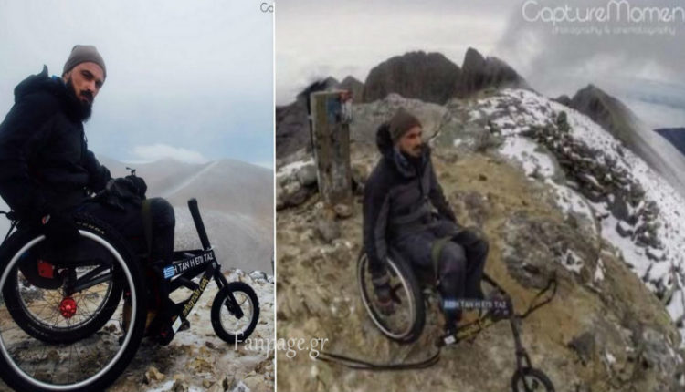 Στην κορυφή του Ολύμπου στην Ελλάδα κατόρθωσε να ανεβεί ο παραπληγικός Γιώργος Τίρρης, που έπειτα από ατύχημα καθηλώθηκε σε αναπηρικό καροτσάκι».