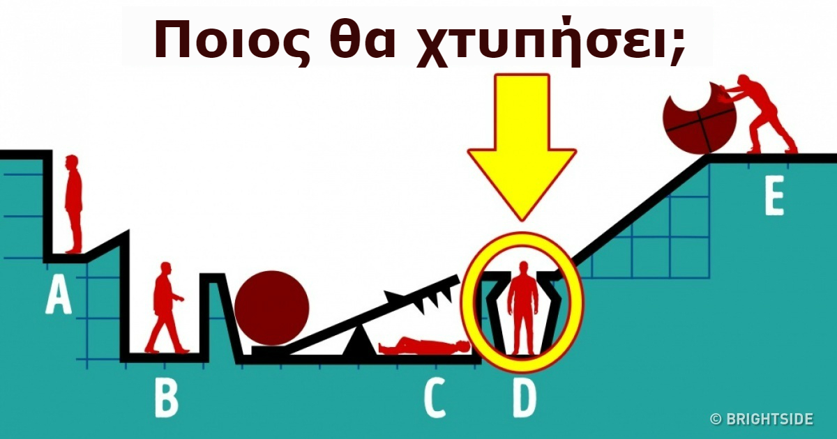 Ο D θα χτυπηθεί στο κεφάλι από την μπάλα, ο C θα τρυπηθεί από τα καρφιά όταν η ίδια μπάλα πέσει πάνω στην τραμπάλα και ο Β θα χτυπηθεί από την μπάλα που λειτουργεί σαν αντίβαρο και θα πεταχτεί προς τα πάνω.