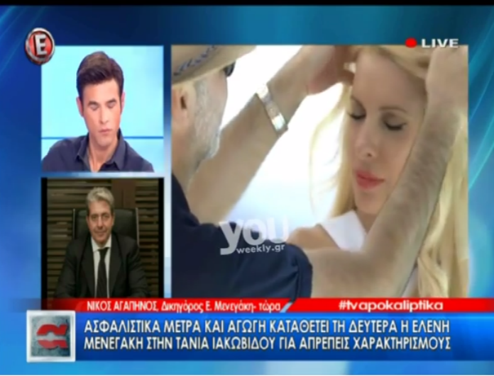 Ο κ. Αγαπηνός, δικηγόρος της λαμπερής παρουσιάστριας, μίλησε για την κίνησή της αυτή: «Η κ. Μενεγάκη έδωσε εντολή να ελέγξω αν υπήρξε κάτι επιλήψιμο που θα μπορούσε να αποτελέσει αντικείμενο προσφυγής στα δικαστήρια από την εκπομπή σας. Η προσωπική μου εκτίμηση, την οποία ακολούθησε η κ. Μενεγάκη, είναι ότι ακούστηκαν επιλήψιμες εκφράσεις και αναφορές της κ. Ιακωβίδου, για τις οποίες και θα υπάρξει προσφυγή στη Δικαιοσύνη, γιατί προσβάλλουν βάναυσα την τιμή και υπόληψη της κ. Μενεγάκη!
