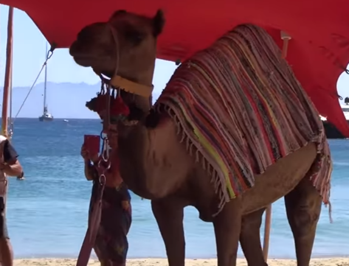 Και ξαφνικά, το απογευματάκι, την ώρα που ετοιμαζόντουσαν να υποδεχθούν τους καλεσμένους τους, σκάνε μύτη στην παραλία της Ψαρού καμήλες… Όχι! Δεν ήταν ψεύτικες για διακόσμηση! Ήταν ολοζώντανες καμήλες που είχαν δέσει σε δύο παλούκια στην παραλία, αφήνοντας τες εκεί για να φωτογραφηθεί ο κόσμος. Και γιατί τις πήγαν εκεί; Για να είναι στο κλίμα η όλη ατμόσφαιρα και οι καλεσμένοι να νιώσουν σαν το σπίτι τους…