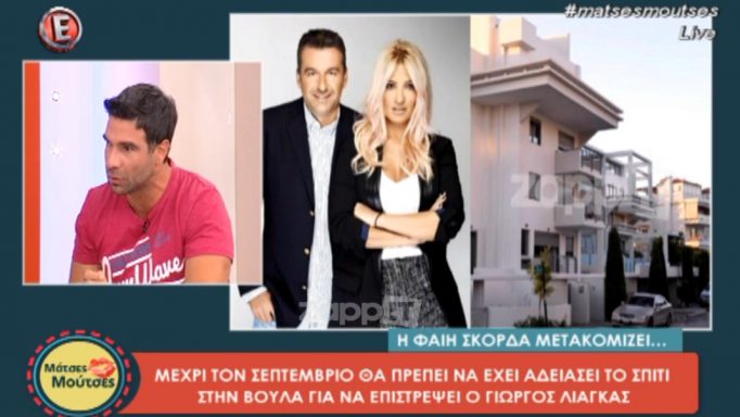 «Ο Γιώργος Λιάγκας τον Σεπτέμβρη επιστρέφει στο σπίτι του στη Βούλα. Πρόκειται για ένα σπίτι που αγόρασε το 2009, λίγους μήνες πριν παντρευτεί τη Φαίη Σκορδά. Όταν χώρισαν αποφάσισε να φύγει εκείνος και να αφήσει τη Φαίη με τα παιδιά στο σπίτι της Βούλας. Πλέον, ο Γιώργος Λιάγκας επιστρέφει. Η Φαίη Σκορδά έχει ήδη βρει κάποια σπίτια στα βόρεια και τα νότια προάστια και όταν γυρίσει από τις καλοκαιρινές της διακοπές, θα πάρει τα πράγματά της και θα μετακομίσει στο δικό της σπίτι μαζί με τον Γιάννη και τον Δημήτρη. Ο Γιώργος θα ξενοικιάσει στο σπίτι στη Βουλιαγμένη και θα επιστρέψει στη βάση του, στη Βούλα», ανέφερε χαρακτηριστικά ο Μαρίνος Βυθούλκας.