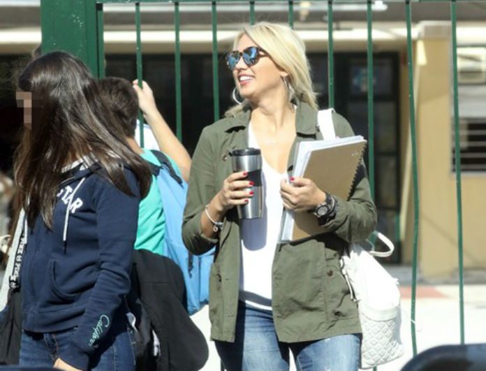 Ο φωτογραφικός φακός την απαθανάτισε στο προαύλιο του σχολείου, ντυμένη casual και με τον καφέ ανά χείρας, ενώ, όπως είχε παραδεχθεί η ίδια σε αναρτήσεις της στα stories του Instagram, η πρώτη μέρα με τους μαθητές ήταν δύσκολη!