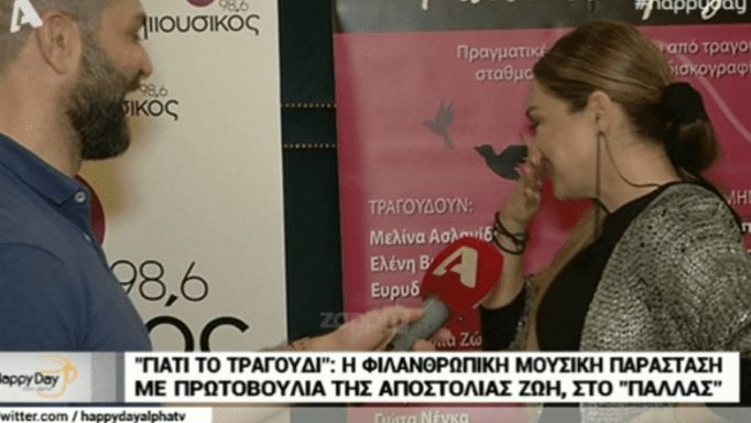 Μία συγκλονιστική εξομολόγηση από την Αποστολία Ζώη on camera. Μιλώντας στο Happy Day και το Μιχάλη Πλεμμένο, αναφέρθηκε στη φιλανθρωπική παράσταση «Γιατί το τραγούδι», που κάνει πρεμιέρα στις 19 Νοεμβρίου στο Παλλάς. Τα έσοδά της θα δοθούν στο ογκολογικό νοσοκομείο Άγιοι Ανάργυροι, ενώ συνολικά διοργανώθηκε με πρωτοβουλία της τραγουδίστριας.