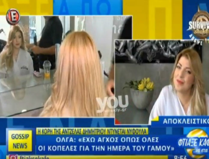Η κόρη της Άντζελας Δημητρίου, Όλγας Κιουρτσάκη, ανεβαίνει αύριο τα σκαλιά της εκκλησίας με τον άντρα της ζωής της, και μίλησε στην κάμερα της Κατερίνας Καινούργιου, δίνοντας μια ιδέα για το νυφικό χτένισμα.