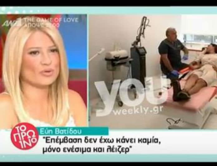 Σήμερα στην εκπομπή Πρω1νό προβλήθηκε ένα στιγμιότυπο που η Εύη Βατίδου έκανε μια θεραπεία με laser στο πρόσωπο της.