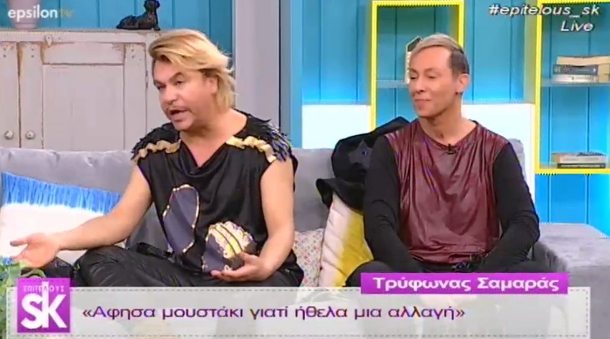 «Την τελευταία φορά που πήγαμε στο Θέμο μαζί δεν με άφησε να βγάλω λέξη».«Καλέ, παπ… λέει τώρα! Απλά ήμουν ωραιότερος και άφρισε» απάντησε ο Βασίλειος Κωστέτσος που άφησε τα «γαλλικά» του ελεύθερα στον αέρα της εκπομπής.Λίγο αργότερα η κουβέντα θα ερχόταν στο μουστάκι που έχει λανσάρει ο Τρύφωνας Σαμαράς, αλλά και στα σχόλια που έχει ακούσει..«Ήθελα να κάνω μια αλλαγή…Φυσικά ακούγονται διάφορα… Σε άλλους αρέσει, σε άλλους δεν αρέσει», έλεγε ο Τρύφωνας Σαμαράς όταν ο Βασίλειος Κωστέτσος συμπλήρωσε:«Είναι ο φερετζές του…»