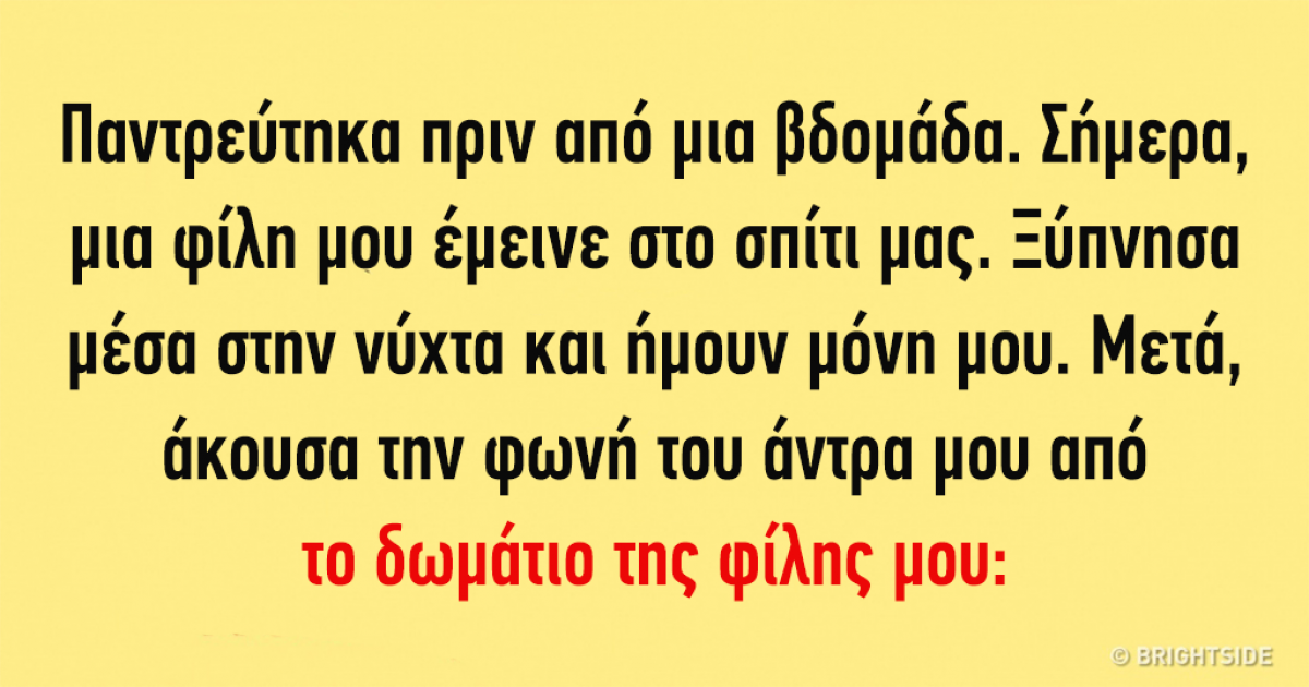 - “Παντρεύτηκα πριν από μια βδομάδα. Σήμερα, μια φίλη μου έμεινε στο σπίτι μας. Ξύπνησα μέσα στη νύχτα και ήμουν μόνη μου. Μετά, άκουσα τη φωνή του άντρα μου από το δωμάτιο της φίλης μου: “Δε θα ακούσει τίποτα. Έλα!” Μπήκα μέσα στο δωμάτιο έτοιμη να τους σκοτώσω και τους δυο… και εκείνοι κάθονταν και έπαιζαν σκάκι!”
