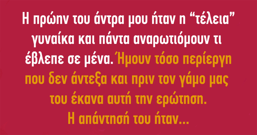 “Η πρώην του άντρα μου ήταν η “κυρία τέλεια”. Ήταν όμορφη, έξυπνη και η όρεξή της για ζωή πάντα ενέπνεε τους άλλους. Τον άκουσα να λέει ότι δεν ήταν μια απλή περιπέτεια και ότι ήταν πολύ ερωτευμένος μαζί της. Με έτρωγε η περιέργεια και βασάνιζα τον εαυτό μου με μια ερώτηση “Τι βλέπει σε μένα;”