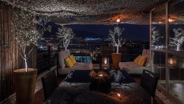 Στη μια πλευρά το Jacuzzi με θέα στην πόλη, αλλά και καλυμμένο από πλέγμα ώστε να εξασφαλίζει ιδιοτικότητα, στην άλλη πλευρά μία μεγάλη τραπεζαρία φαγητού, και στη μεγαλύτερη γωνία του χώρου ένα καθιστικό με χαμηλούς φουσκωτούς καναπέδες, πλαισιωμένα από φωτιζόμενες ελιές.