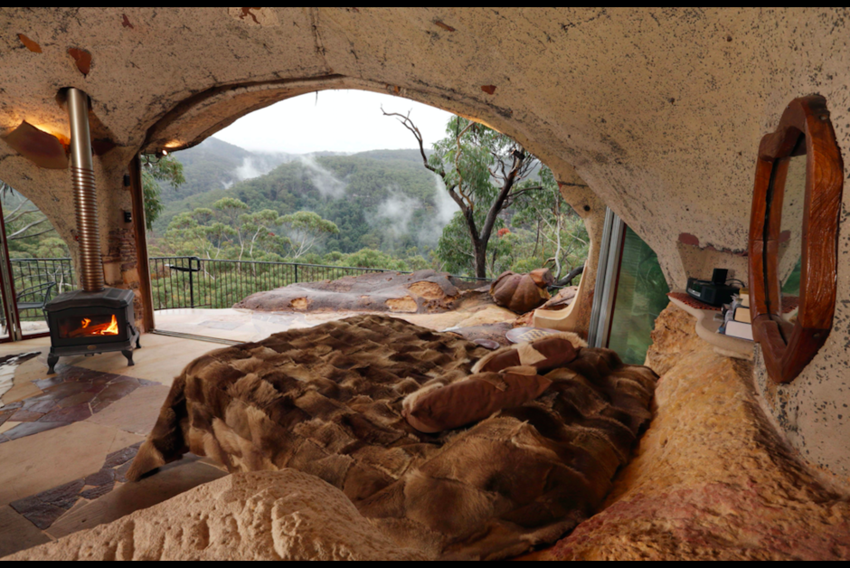 Το εξοχικό είναι μια πραγματική σπηλιά σε βράχο στην οποία δημιούργησε και βεράντα η οποία χαρίζει μαγευτική θέα στην κοιλάδα των Γαλάζιων Πεύκων της Αυστραλίας.Οι πόρτες είναι φυσικά από διπλά τζάμια και η θέα από ψηλά κόβει την ανάσα.
