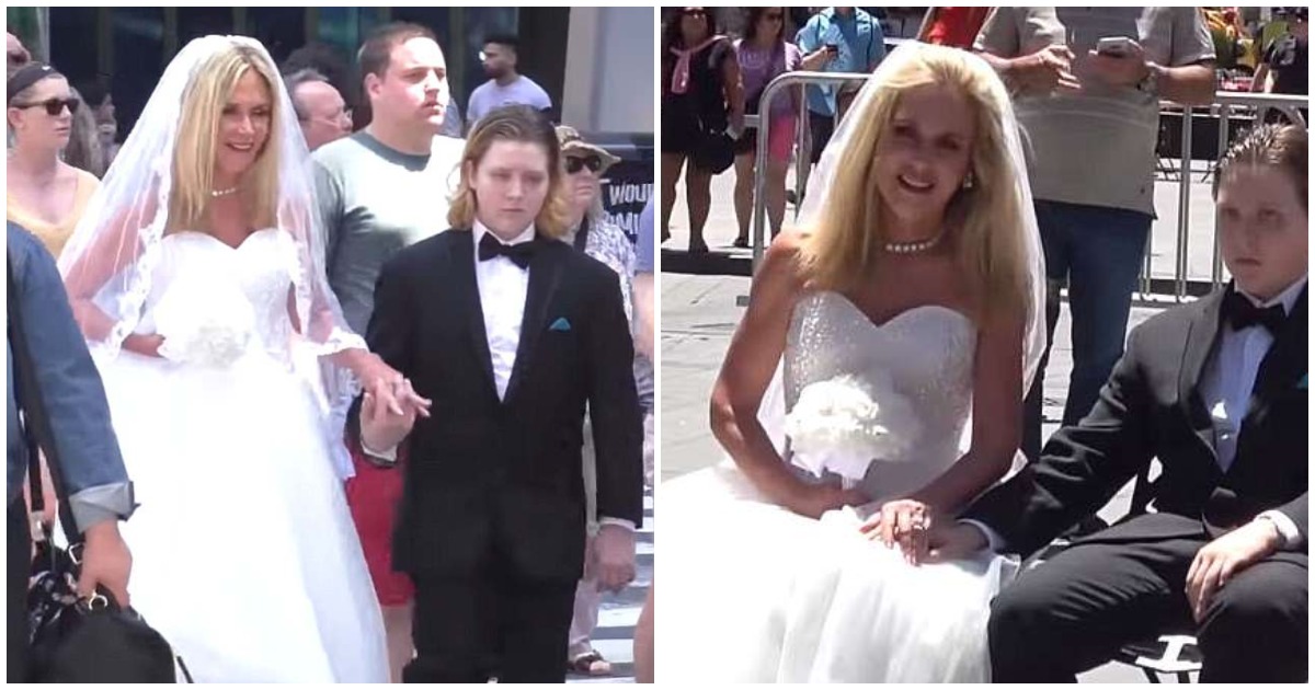 Μια άλλη γυναίκα βγαίνει αργότερα, ρωτώντας τη νύφη: “Με συγχωρείτε. Πόσο χρονών είναι;”Όταν της είπε ότι το αγόρι είναι 12 ετών, η γυναίκα ρωτάει πού βρίσκεται η μητέρα του, και η νύφη δηλώνει για άλλη μια φορά ότι έχει άδεια από τους γονείς του.“Εντάξει, αυτό είναι αηδιαστικό,” απαντά η γυναίκα, σαφώς εξοργισμένη, και προσθέτει: “Τι να περιμένεις με μια διεφθαρμένη κυβέρνηση;”Τελικά, η νύφη και ο γαμπρός πηγαίνουν να ποζάρουν στην κόκκινη σκάλα της Times Square, με τον Coby και πάλι να ζητάει από το αγόρι να χαμογελάσει.