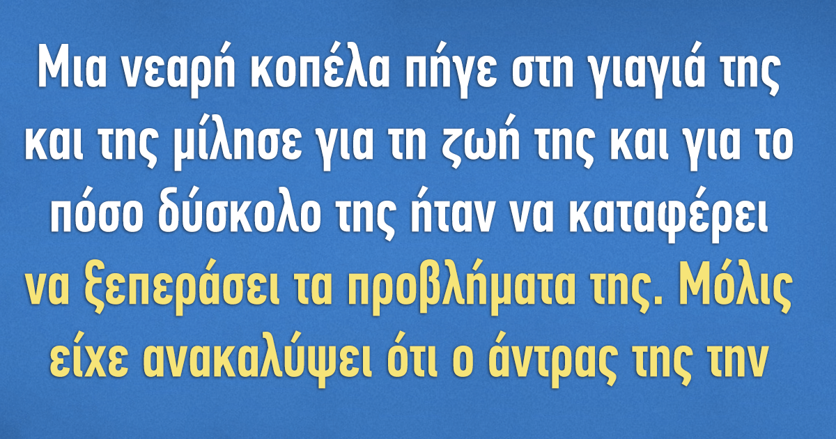 Μια νεαρή κοπέλα πήγε στη γιαγιά της και της μίλησε για τη ζωή της και για το πόσο δύσκολο της ήταν να καταφέρει να ξεπεράσει τα προβλήματα της. Μόλις είχε ανακαλύψει ότι ο άντρας της την απατάει και ένιωθε συντετριμμένη.Αλλά δεν ήταν μόνο αυτό. Πρόσφατα την είχαν απολύσει από την δουλειά της και πίστευε ότι αν χώριζε θα αντιμετώπιζε τρομερές οικονομικές δυσκολίες για να μεγαλώσει τα παιδιά της.