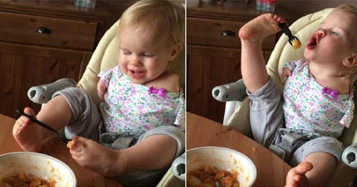 Η μικρή ήδη μάθει πώς να τρώει μόνη της χρησιμοποιώντας τα πόδια της.