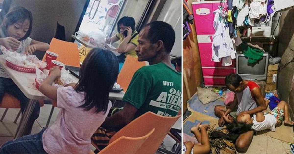 Δεν έχει αρκετά χρήματα για να πάρει κι εκείνος ένα γεύμα. Τα χρήματα που παίρνει ο Ryan Arebuabo από τη δουλειά του φτάνουν ίσα-ίσα για να τα βγάλει πέρα και να στείλει κάθε μέρα τα δύο όμορφα κορίτσια του στο σχολείο.Η ιστορία του έγινε γνωστή από τον Jhunnel Sarajan, ο οποίος ήταν στο ίδιο εστιατόριο και τράβηξε μια φωτογραφία της οικογένειας, η οποία έγινε viral αφότου την ανάρτησε στο προφίλ του στο Facebook.