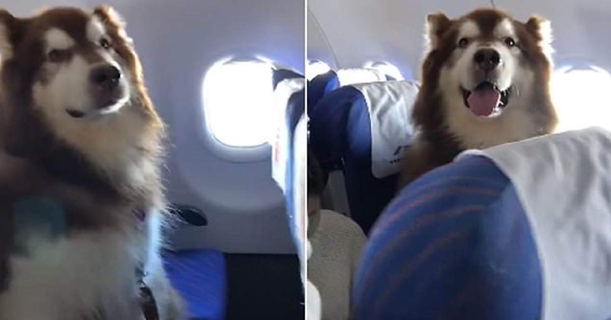 Ένα μεγάλο καφέ Μάλαμουτ Αλάσκας κάθισε ήσυχα στο κάθισμά του, αφού του επετράπη να ταξιδέψει στην πτήση για να συνοδέψει τον ανάπηρο ιδιοκτήτη του.