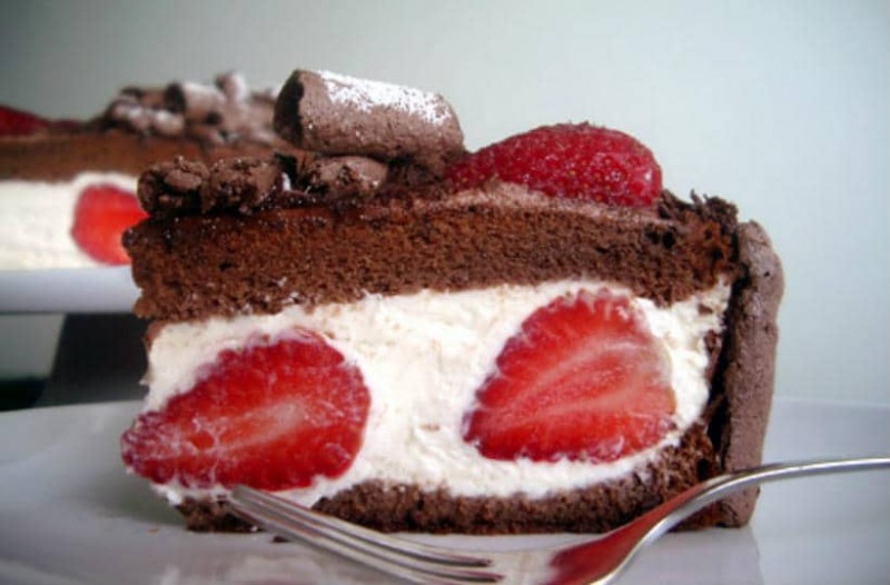 Λαχταριστό κέικ σοκολάτας, με αφράτη κρέμα γαρνιρισμένο με φρέσκες φράουλες.