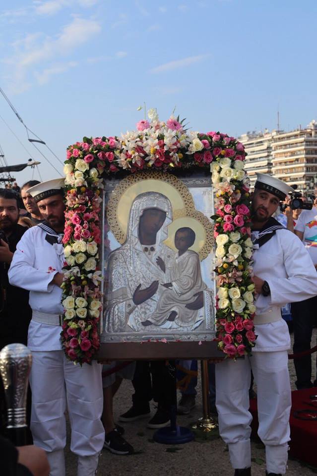 Με μεγαλοπρέπεια και συγκίνηση υποδέχθηκαν την εικόνα οι Θεσσαλονικείς και ο Μητροπολίτης Θεσσαλονίκης κ Άνθιμος καθώς και ιερείς της Μακεδονίας. Μαζί με την εικόνα μεταφέρθηκε στην Θεσσαλονίκη και κομμάτι του τίμιου ξύλου.