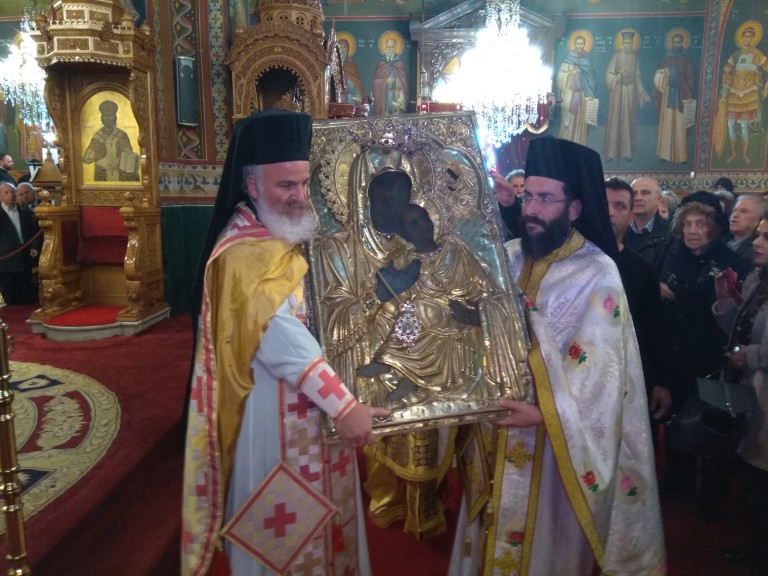Ακολούθως τελέστηκε Ιερά Παράκληση στην Παναγία και η θαυματουργή Εικόνα της μεταφέρθηκε από το θρόνο λιτάνευσης στο μόνιμο θρόνο της. Ο Σεβασμιώτατος στο κήρυγμά του αναφέρθηκε στα μηνύματα της εορτής της Υπαπαντής του Χριστού, κάνοντας ιδιαίτερη αναφορά στήν ιερότητα του προσώπου της Υπεραγίας Θεοτόκου.