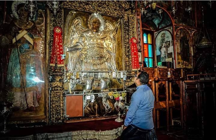 Η επιβλητική, θαυματουργή εικόνα του, σύμφωνα με επιγραφή πάνω στην ασημένια ποδιά του, φιλοτεχνήθηκε το 1724 από τον αξιόλογο τεχνίτη Ιωάννη τον Πελοποννήσιο. Η μονή εορτάζει στις 8 Νοεμβρίου και της Πεντηκοστής, με κοσμοσυρροή πιστών να κατευθύνεται εκεί για να προσκυνήσει.