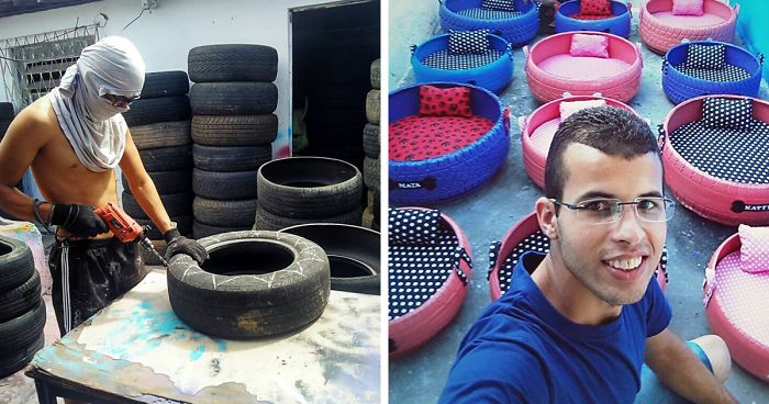 Όταν παρατήρησε ότι τα παλιά ελαστικά χρησιμοποιούνταν ως καταφύγιο από τα αδέσποτα σκυλιά, του ήρθε η ιδέα να φτιάξει χαριτωμένα και άνετα κρεβατάκια γι’ αυτά.