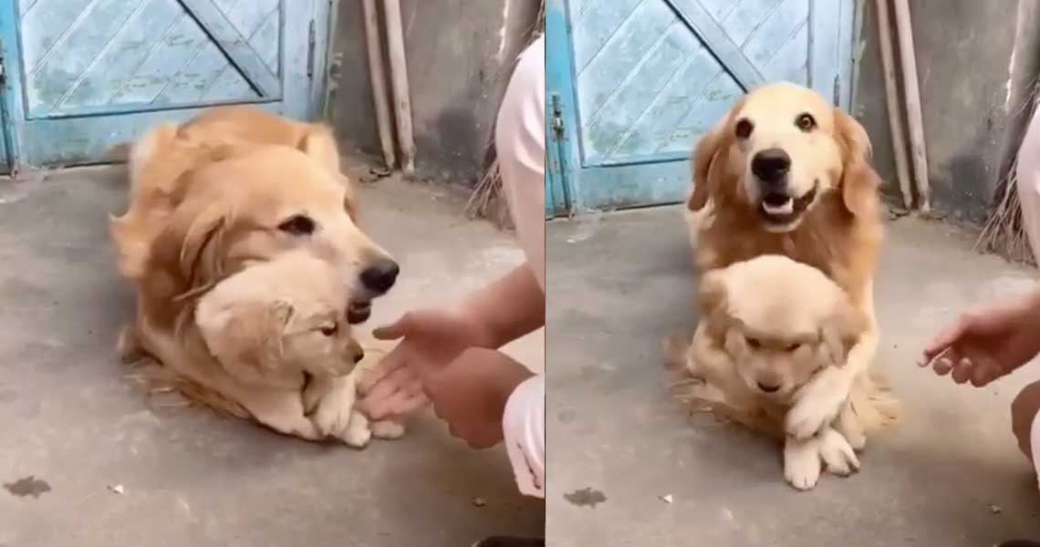 Όπως θα δείτε, δεν αφήνει ούτε τον άνθρωπο που τους φροντίζει να πάρει το μικρό κουτάβι μία στιγμή μακριά της.
