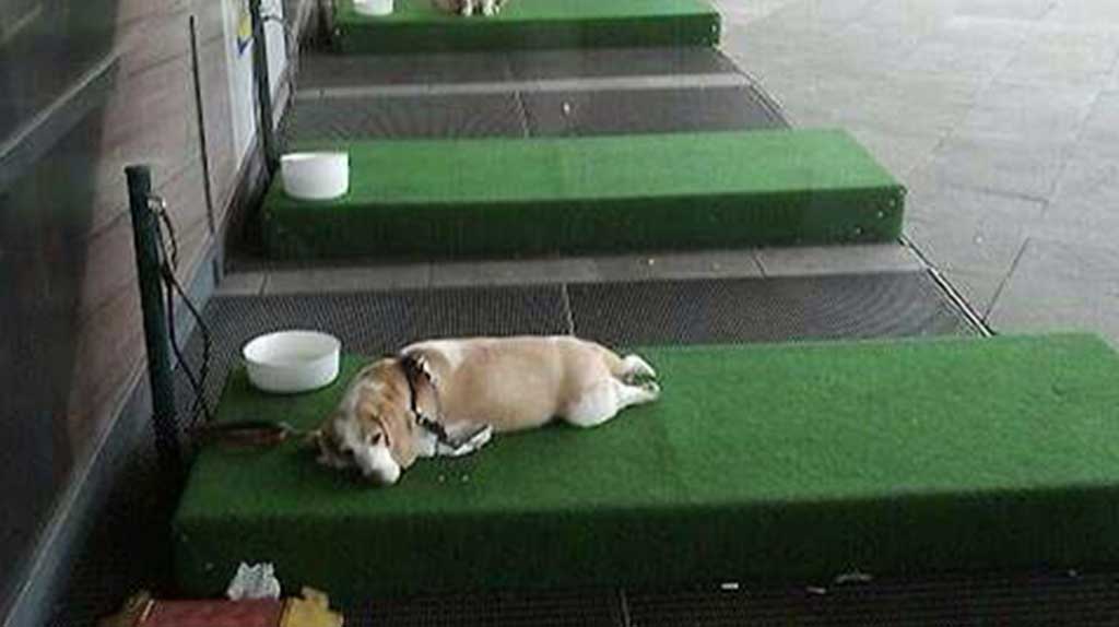 Στο τεχνητό γρασίδι και με ένα μπολ νερού υποδέχεται το κατάστημα και τους τετράποδους φίλους των επισκεπτών του.