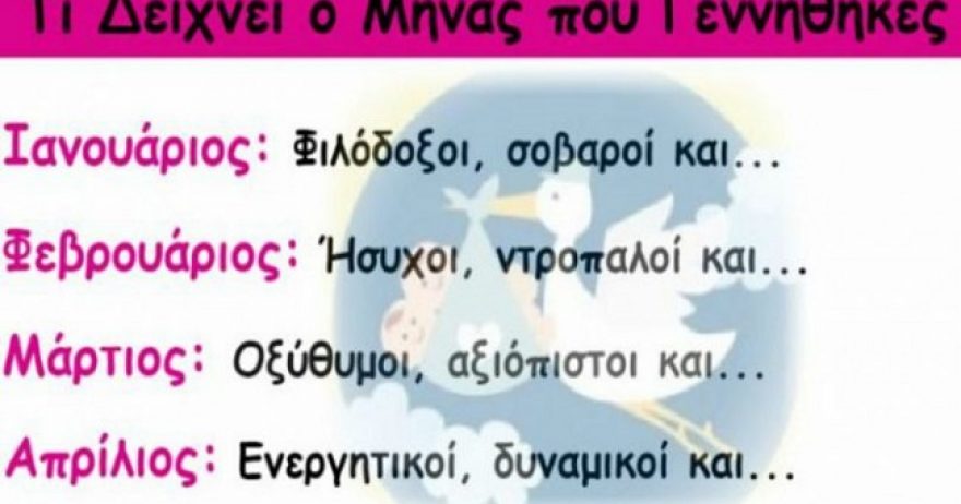 Κι όμως ο μήνας που γεννηθήκαμε δείχνει πάρα πολλά… Ακόμη και για αυτούς που δεν πιστεύουν στα ζώδια, η ανάλυση των στοιχείων της προσωπικότητάς τους βάσει ζωδίου είναι αρκετά ευχάριστη ασχολία. Γνωρίζατε όμως ότι ανεξάρτητα από το ζώδιο του καθενός πολλά από τα χαρακτηριστικά μας έχουν σχέση και με τον μήνα της γέννησής μας;